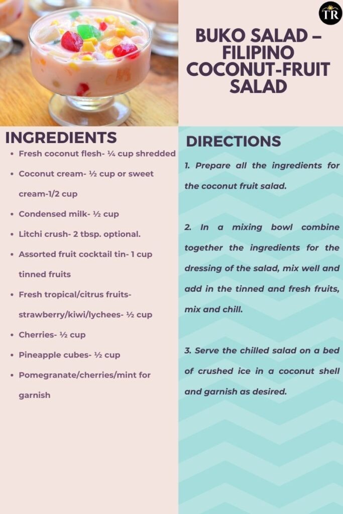 Buko Salad: is a classic Filipino tropical fruit salad using canned fruit cocktail, cherries, and pineapple dressed up in an immensely sweet condensed milk-based coconut cream and tender coconut shreds as a part of this served chilled.