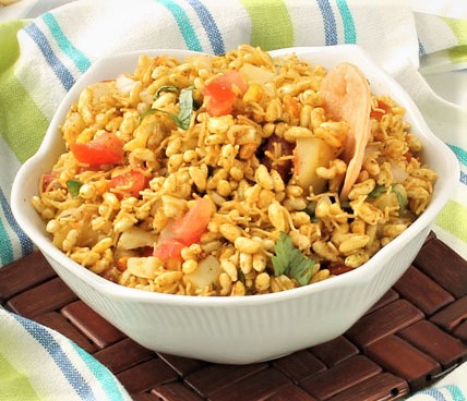 In Mumbai bhel puri is enjoyed as a beach savouries or comfort snack. Bhel puri always tastes good when prepared and served immediately. Normally juices of tomatoes and chutneys are used to soften the puffed rice and to add flavor to the bhel puri. Another dry variant of bhel puri called bhadang is also enjoyed throughout North India. Bhadang is served after garnishing with coriander, lemon juice and onions.