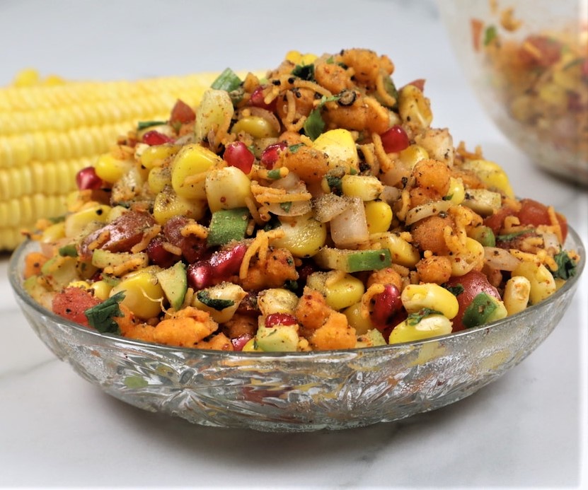 | For the Bhel Mix: Kurmura / puffed rice- 2 cups Flat papdi- 10-12 no Nylon sev / bhujia- ½ cup Onion-1/2 cup chopped Raw mango- 2-3 tsp chopped Tomato-1/2 chopped Green chilli-1 tsp chopped Boiled sweet corn-1/2 cup Roasted/fried peanuts-1/4 cup Pomegranate seeds-1/2 cup Apple-1/2 no cubed Salt to taste Chaat masala-1/2 tsp Lime juice-1-2 tsp Boiled cubed sweet potatoes-1/2 cup Also try adding a fruit like guava cubes- ½ cup Assorted farsan/ gathiya etc as desired- ¼ cup Assorted chutneys: Green mint-coriander, Red chili and garlic, Sweet jaggery and sour tamarind chutney or saunth- with ginger powder, Date chutney etc. | 1. Assemble the ingredients for the bhel and keep ready. 2. In a mixing bowl, combine together the listed ingredients, adding a little fruity element into a bhel also creates crunch, variety and colour combination in bhel puri concepts. 3. Add in the chutneys and seasonings and give it a nice toss and mix. 4. Dish out into the serving bowls/ dishes immediately and garnish with fresh coriander/ roasted crushed peanuts/sev/ fresh pomegranate seeds etc. |