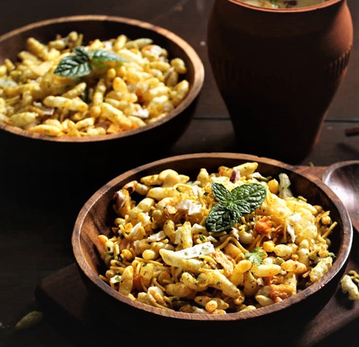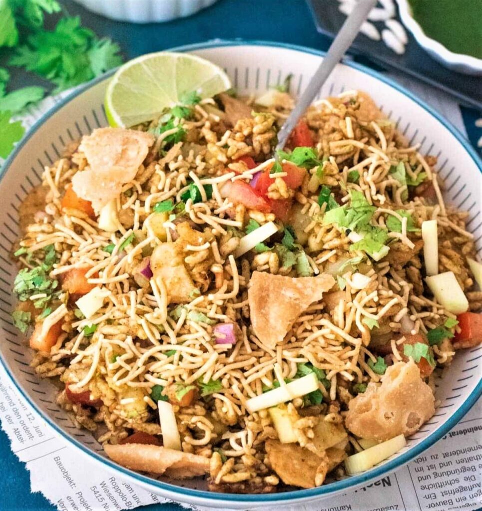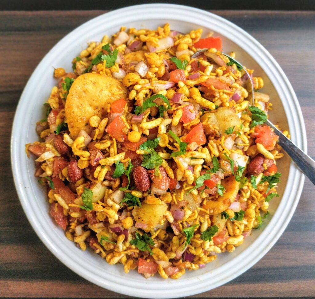 Bhel Puri is a savoury snack originating from India, and is also a type of chaat. It is made of puffed rice, vegetables and a tangy tamarind sauce, and has a crunchy texture. Bhel is often identified as a ‘beach snack’, strongly associated with the beaches of Mumbai, such as Chow patty or Juhu. Bhel puri is thought to have originated within the Gujarati cafes and street food stalls of Bombay, and the recipe has spread to most parts of India where it has been modified to suit local food availability. It is also said to be originated from Bhadang, a spicy namkeen from Western Maharashtra