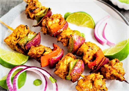 | 500gms- boneless, chicken cubes 1 green capsicum- cut into cubes 1 onion- cut into cubes Tomato-1 no cut into cubes, no seeds. For the marination: 2 tbsp. – oil 1 tsp- ginger –garlic paste Salt and pepper to taste ¼ tsp turmeric powder ½ tsp red chili powder ½ tsp garam masala powder 1 tsp kasoori methi 2 tsp lime juice 1 tsp white vinegar 2 tsp cashew paste 2 tsp cream ¼ cup, whipped thick yoghurt | 1. Prepare all the ingredients for the grill recipe. In a mixing bowl combine together the yogurt, cream and other ingredients for the marination. Add in the chicken cubes into the bowl mix well and keep refrigerated for 20-25 mins. 2. In the meantime, prepare the other cubes of veggies as desired. Thread up the chicken cubes with onion, capsicum, tomato cubes on grill skewers and place the skewers on a platter/thali and chill until being prepared further. 3. To start the cooking process, ensure the griller /grill pan is completely clean and grease the griller with a little oil and heat for 3-4 mins on a medium flame. Place the set skewers on the hot grill and allow to settle a little for a few mins and then carefully turn it over, cook from all sides and apply little marination/oil while being cooked to maintain the moisture content. 4. Remove and place the skewers on a serving platter and serve with assorted dips/chutneys/sauces. |