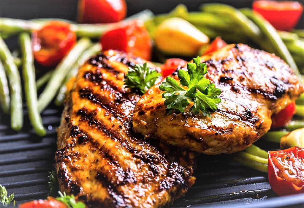 | 500 gms chicken breasts/ thighs with bones. For the marination: 2 tbsp. oil 1 tsp garlic, chopped Salt and pepper to taste 2 tbsp. white wine 1 tsp honey 1 tsp mustard paste ½ tsp mixed herbs ½ tsp chilli flakes ½ tsp garam masala powder For the accompaniments with the chicken: 1 cup sliced carrots, blanched 10-12 no- french beans, cut 1 x 2 and blanch 1 cup mashed potatoes. Assorted breads/ bread rolls to serve. | 1. Prepare the marination for the chicken in a mixing bowl and allow the chicken pieces to rest in the marination for 30- 45 mins in the refrigerator. 2. Grease the grill pan with a little oil and heat up for a minute, and then place the marinated chicken pieces, allow to settle for a minute before turning the sides and cook the chicken pieces on the griller for 5-7 mins or until the juices running out are clear. 3. Meanwhile, the blanched vegetables can be tossed in a pan with little butter, salt and pepper and cook for 2-3 mins and keep aside. 4. To serve the recipe, place a little mashed potato in the centre of the dinner plate, arrange the grilled chicken pieces on it, and surround it with colourful tossed veggies of your choice and serve with bread rolls. |