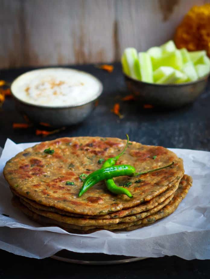 | For the paratha dough: Atta- 1 cup Maida-1/2 cup Oil/ghee- 2 tsp Salt -1/4 tsp Water as needed For the stuffing of the paratha: Sweet potato- 300 gms, boiled, peeled and mashed Salt to taste Coriander leaves- 2 tbsp. chopped Aamchur powder-1/2 tsp Green chillies- 2 tsp chopped Ginger- 1 tsp chopped Mint leaves- 2 tbsp. chopped Chaat masala-1/2 tsp Garam masala powder-1/4 tsp Dried pomegranate seeds- 1 tsp Boiled mashed green peas- ½ cup To serve with: Curd/ papad/ pickle/ raita. | 1. Prepare all the ingredients for the paratha dough and the stuffing, and keep them ready. 2. The dough needs to be worked on first since it needs resting to roll it out easily, and it gets better to work with in terms of stretch ability. 3. In a mixing bowl, combine the ingredients with the boiled mashed sweet potato and prepare the chatpata stuffing for the parathas. 4. Divide the dough into 6-8 portions and stuff them one by one, roll out to ½ inch thickness and using a tava, oil/ butter/ ghee, cook the parathas on both sides to a nice golden brown colour. Serve hot with accompaniments. |