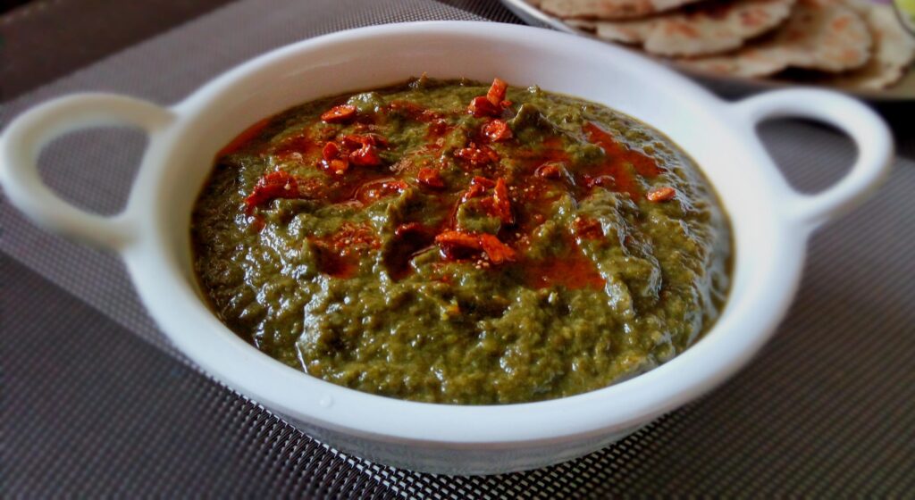 | Amaranth greens-1 large bunch, cleaned Spinach-1 medium bunch, cleaned Dill leaves- ½ cup, cleaned Methi leaves-1 cup, cleaned Onion-2 med sized chopped Tomatoes-2 med sized chopped Green chillies- 3-4 no chopped Ginger- 2 tsp chopped Garlic- 2-3 tsp chopped Cumin seeds-1 tsp Coriander powder- 1 tsp Besan-1 and a half tbsp. Oil- 2 tsp Ghee-1 tsp Salt to taste Water-1/2 cup For the tempering: Butter/ ghee-1 tbsp. Garlic-1 tsp sliced Red chili powder-1/2 tsp Hing-1/4 tsp | 1. Clean and thoroughly wash all the greens and keep aside, roughly cut them or tear them. 2. Using a pressure cooker or an open container add in all the greens, green chilies, ginger, garlic, 1 onion, tomatoes, salt and 1 cup water and cook/ pressure cook for a whistle or 5-7 mins. 3. Cool down, puree or using a hand blender grind to a coarse textured paste. 4. In a pan, heat oil and add in the rest of the chopped onion saute until light browned, add the puree of the greens and salt, coriander powder, cook for 2-3 mins. 5. Combine besan into the mixture and saute, allow to cook on a low flame for 2-3 mins. 6. Now heat up butter/ ghee and prepare the tempering for the saag, once it is already adding it into the saag and mix well, serve hot with makki di roti, parathas, phulkas. |
