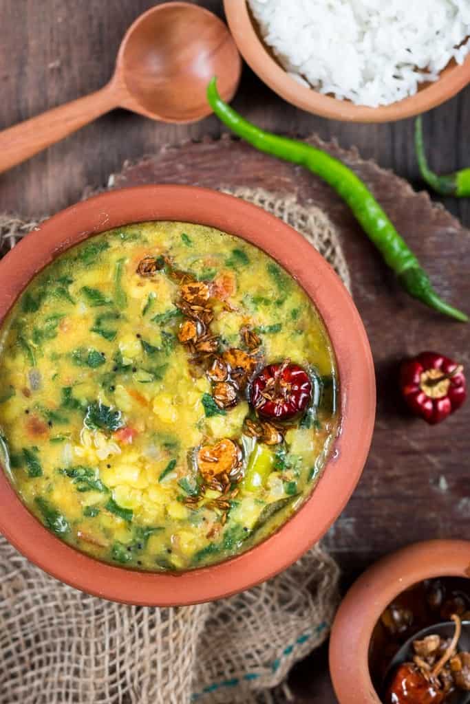 | Toor/ Arhar ki dal- 1 and a half cup Amaranth leaves – 1 and a half cup Garlic- 2-3 cloves, chopped Ginger-1 tsp chopped Green chillies-2-3 slit Curry leaves- 8-10 no Cumin seeds-1/2 tsp Mustard seeds-1/2 tsp Hing-1/4 tsp Onion-1 small chopped Tomato-1 med chopped Coriander powder-1 tsp Oil-1 tsp Ghee-1 tsp Salt to taste Sugar-1/2 tsp Tamarind pulp-2-3 tsp | 1. Clean, wash and soak the Toor dal for 20 mins. 2. heat oil and ghee add in the ingredients for the tadka one by one and allow them to crackle and splutter and then add in the onions, saute them to a light brown, add in chilies, tomatoes and cook for 1-2 mins. 3. Now add in the drained dal, cleaned and roughly cut amaranth leaves, salt to taste, coriander powder, sugar and 2-3 cups of water. 4. Allow to come to a boil, simmer and cook on a low flame for 20-25 mins, add water as needed. Allow dal to get soft. 5. Now add in the tamarind pulp for a little tart flavor and allow to simmer for another 3—4 mins. the same recipe can be made using a pressure cooker as well and 3-4 whistles can be given to the same. 6. Serve the dal amaranth hot with phulkas, rotis, parathas, salad and pickle/ raita. |