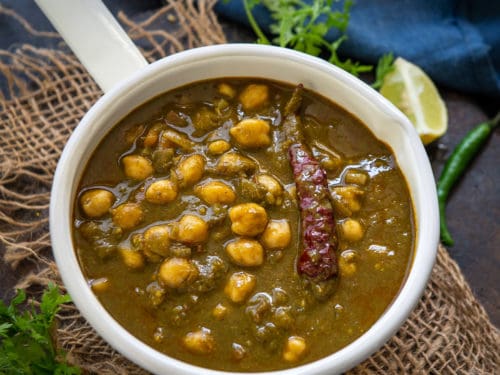 | Oil-2 tsp Ghee-2 tsp Boiled kabuli chana- 1 and a half cup Boiled potato cubes-1 cup To grind all to a paste: Ginger-1 tbsp. Garlic- 4-5 cloves Bay leaves- 2 no Pepper corns- 4-5 no Cinnamon stick- 1 small piece Green chillies- 2-3 no Onions-1 cup sliced Water-1/2 cup to grind all the above For the cooking: Spinach-1 cup blanched, puree Fresh mint-1/2 cup Fresh coriander- 1 cup Salt to taste Chhole masala-1 tsp Turmeric powder-1/2 tsp Coriander powder-1 tsp Cumin powder-1/2 tsp Red chilli powder-1/2 tsp Garam masala powder-1/2 tsp Curd- ½ cup thick, beaten up Tomato puree-1/2 cup Water-1/2 cup Kasuri methi-1 tsp Fried red chilli- 2 no for garnish | 1. Prepare all the ingredients for the recipe as listed above. 2. Boil the chana and the potatoes; keep them all ready. 3. Refer to the list of things to be combined into a mixer jar and ground to a paste using a little water. 4. To start cooking, heat oil and ghee in a pan, add in the prepared paste of spices and onions, saute it to a nice light brown shade, add a little water gradually. 5. Add in the tomato puree, salt and all the powdered spices, cook for a few minutes, add in little beaten up curds and then add the kasuri methi, the spinach puree, mint, and coriander as well. 6. Now add in the boiled chana and potatoes and mix well. add little water as per gravy requirements and simmer, cover and cook for 10-12 mins and serve hot garnished with fried red chili. |