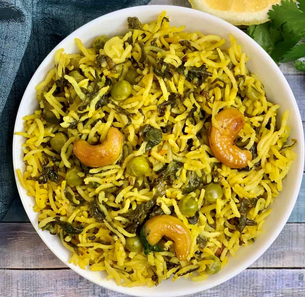 | Basmati rice- 1 and a half cup, washed and soaked for 15 mins. Oil-2 tsp Ghee-1 tsp Bayleaf- 2 no Peppercorns- 4-5 no Cinnamon stick- 1 piece Ginger garlic paste-1 tsp Onions -1 cup sliced Tomatoes-1/2 cup chopped Green chilies-2 tsp chopped Salt to taste Fresh spinach-2 cups, blanched and chopped Fresh methi leaves- 1 cup, cut Fresh coriander leaves- 2-3 tbsp. chopped Green peas-1 cup boiled Cashews-2-3 tbsp. fried Raisins- 2-3 tsp Coriander powder-1 tsp Turmeric powder-1/2 tsp Red chilli powder1/2 tsp Water- as needed Green capsicum- ½ cup, cut Garam masala powder-1/4 tsp To serve with: Papad/pickle/raita/ chaas- as desired | 1. Prepare all the ingredients for the recipe as listed. 2. Clean, wash and soak the rice. 3. Meantime start with the cutting chopping of veggies, greens and then start with the recipe. 4. To start cooking, heat oil and ghee in a pan add in the whole spices and then the sliced onions, saute them well until lightly browned and add little water gradually as needed. 5. Now add in the ginger-garlic, chilies and add in the rice and saute it for a minute, add in all the greens and salt, powdered spices and give it all a nice mix, add tomatoes, double the amount of water as compared to the rice. 6.Bring to a boil, simmer and cook until the rice is done and liquid is well absorbed, rice is moist and well risen. Turn off the flame, add fried nuts on top and serve the pulao with curd, raita, chaas, papad etc. |