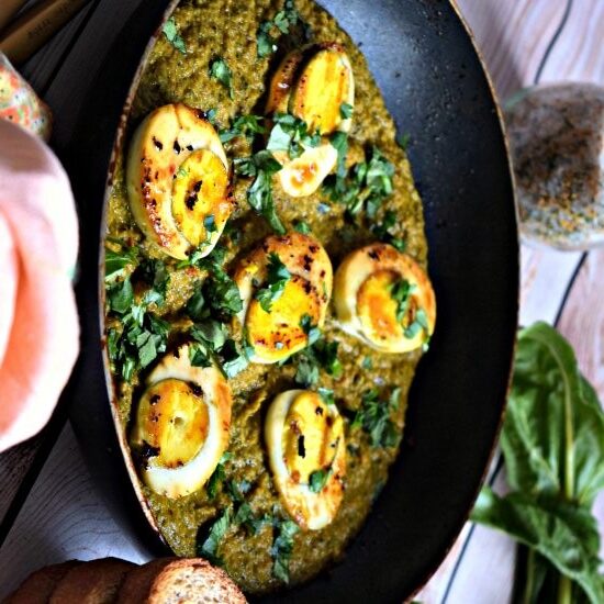 | Oil-2 tsp Ghee-1 tsp Hing-1/4 tsp Cumin seeds-1/2 tsp Ginger-1 tsp chopped Garlic-1 tsp chopped Red chillies-1-2 slit Onion-1/2 cup chopped Tomato-1/2 cup chopped Fresh mint-1/2 cup Fresh coriander-1/2 cup Fresh methi-1/2 cup Fresh spinach-1 cup blanched and chopped Salt to taste Red chilli powder-1/2 tsp Coriander powder-2 tsp Turmeric powder-1/2 tsp Water as needed Boiled eggs- 4-5 no cut 1 x 2 Curd-2-3 tsp Fresh cream-2-3 tsp | 1. Prepare all the ingredients for the recipe as listed. 2. Boil the eggs, shell them, cut 1 x 2 and keep aside. 3. To start cooking, heat oil and ghee in a pan, add in hing, cumin seeds, red chilies, ginger-garlic- chilies and saute for a few seconds, add in the onions, saute for a few seconds, add in tomato, salt and all powdered spices, little water and bhunao. . Add4. Once the masala cooks, a little oil leaves from the sides, add in the greens, curd, cream and mix well, simmer and cook for 3-4 mins, add a little water as needed, and finally get the masala cooking in around 5-6 mins. 5. Turn off the flame and add in the boiled cut egg pieces, dish it out and garnish as desired with ginger juliennes or so and serve hot, enjoy with phulkas, buttered pao, etc. |