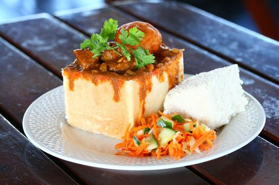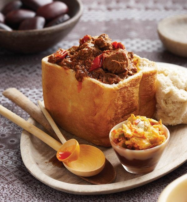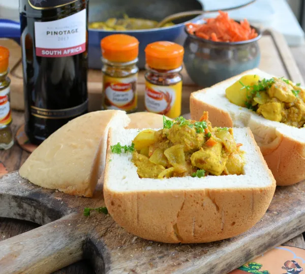 Bunny chow, often referred to simply as a bunny, is a South African fast food dish consisting of a hollowed-out loaf of white bread filled with curry. It originated among Indian South Africans of Durban. A small version of the bunny chow that uses only a quarter loaf of bread is sometimes called a scam bane or kota (“quarter”); it is a name that it shares with sphatlho, a South African dish that evolved from the bunny chow. Bunny chow, often referred to simply as a bunny, is a South African fast food dish consisting of a hollowed-out loaf of white bread filled with curry.