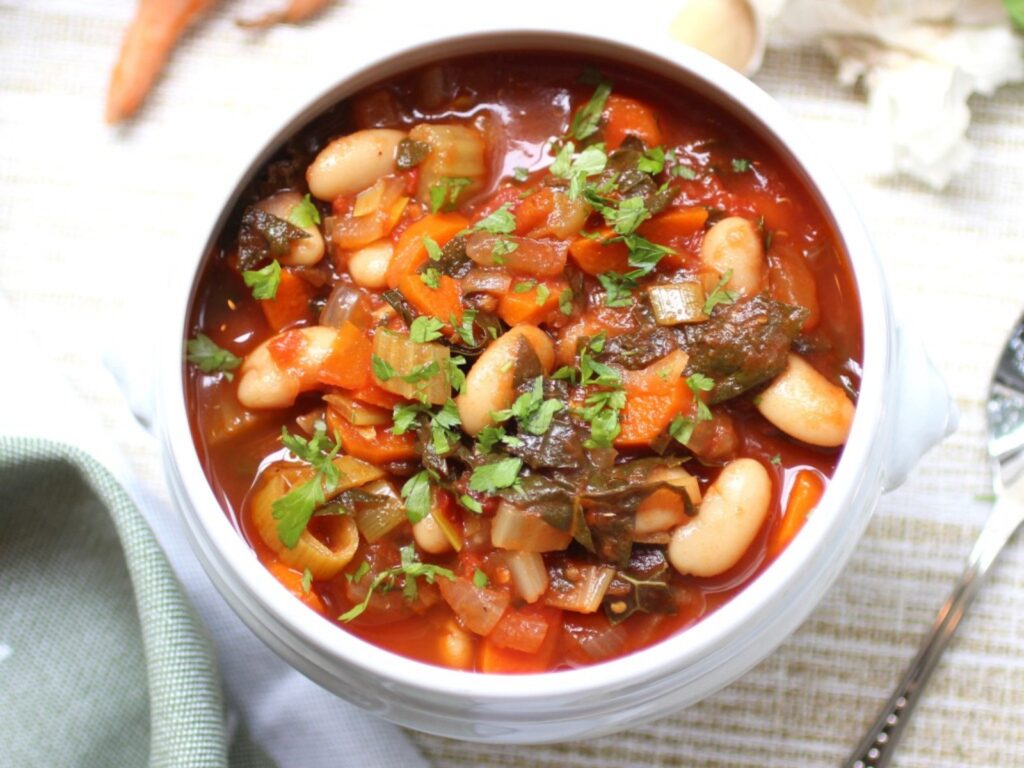 | Olive oil/ oil- 2 tsp Garlic- 2 tsp chopped Onion-1 small chopped Green chilli-1 tsp chopped Potatoes- ½ cup, small cubes Zucchini- ¼ cup cubes Broccoli- ½ cup florets Carrots-1/4 cup, small cubes Boiled beans/ rajma/ tinned baked beans- ½ cup Celery-2-3 tsp chopped Tomato puree-1/2 cup Salt to taste Pepper powder to taste Mixed herbs-1/4 tsp Chilli flakes-1/4 tsp Water/ stock- 3-4 cups Macaroni pasta- ¼ cup Mock meat- 1 cup chunky pieces Grated cheese-2-3 tsp Coriander/ parsley-2-3 tsp chopped Roasted crushed peanuts-2-3 tsp Peanut butter-1-2 tsp Lime juice- 2 tsp | 1. Prepare all the ingredients for the mock meat veggie soup. 2. To make the veg stock using carrots, onions, celery, bay leaf, peppercorns and water, simmer it for 8-10 mins and strain, use that liquid to make the soup. 3. To start up with the soup recipe, heat oil in a pan, add in the garlic, onions and saute for a few seconds. Add in the veggies, tomato puree, macaroni pasta and seasonings, herbs, chilli flakes to taste, add in the mock meat pieces and stir. 4. Add in the vegetable stock and bring to a boil, simmer the soup for 12-15 mins, check for seasonings and adjust the texture of the soup, add in the boiled/ tinned beans and simmer for 5-6 mins more and finally add in the peanut butter, mix and serve hot, garnish the soup with peanut soil and coriander/parsley and a drizzle of lime. |