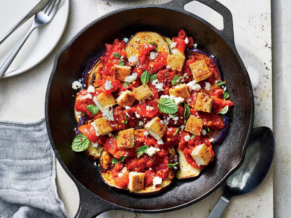 | Mock meat- 1 tin, 400gms, drained Sliced brinjals-150 gms, round slices Zucchini-1 cup, medium cubes Green/red/yellow capsicum-1/2 cup cubes Oil- 2 tsp Salt to taste Pepper powder to taste Onion paste-1 cup Ginger-garlic paste-1 tsp Tomato puree-1 cup Cumin seeds- 1 tsp Green chillies Chilli- 1-2 slit Mixed herbs-1/2 tsp Chili flakes-1/2 tsp Water-1/2 cup Assorted mixed vegetables- 1 cup Garam masala powder-1/4 tsp Fresh basil leaves- 10-12 no Black olives- 3-4 no Green olives- 3-4 no Carrots/ beans/ potatoes/ peas/ cauliflower Fresh coriander leaves- 2 tbsp. chopped | 1. Prepare all the ingredients for the recipe as listed. 2. Slice the brinjal and apply a little oil, salt and pepper and place in the oven for cooking for 12-16 mins at 160 degrees Celsius. 3. Remove and keep aside. Now to prepare the recipe, drain out the mock meat from the tins and cut/ shape into squares or cubes/ use binding agents as needed. 4. To prepare the sauce, heat oil in a pan, add in ginger-garlic paste, onion paste and saute for a few seconds, add in the tomatoes, salt, pepper, herbs, chilli flakes, spices, etc., and saute for 1-2 mins. 5. Add a little water as needed to adjust the texture and allow to cook on a low flame. Pre-prep all the other veggies of your choice, cut, blanch, boil and grill as needed, keep it all ready and add it into the pan and simmer for 4-5 mins. finally add in the mock mat pieces and gently cook for 2-4 mins more. 6. To serve, arrange the cooked brinjal slices at the base of the serving dish and spoon over the cooked mock meat and sauce on top and garnish with fresh herbs, nuts, seeds and coriander leaves etc. |