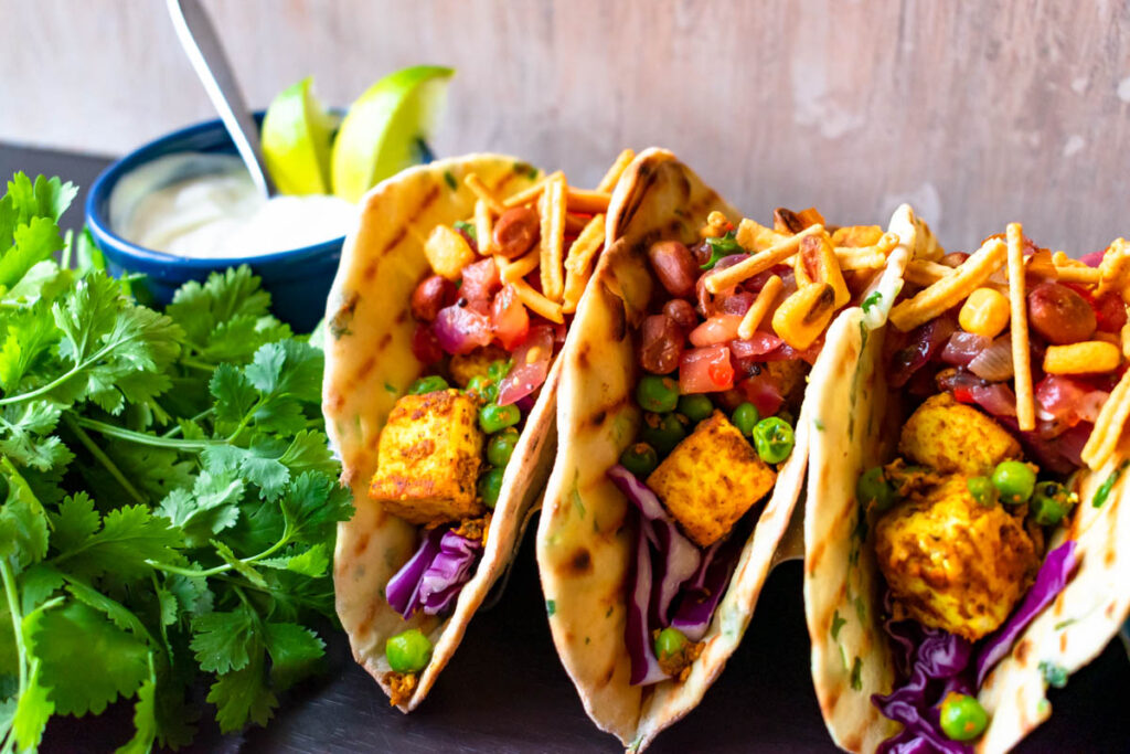 | Taco shells- 8-10 no For the mock meat mixture: Mock meat- 1 cup, cubes/chunks Marination for the mock meat: Curd-1/2 cup beaten Salt to taste Crushed black pepper-1/4 tsp Red chilli powder-1/4 tsp Turmeric powder-1/4 tsp Chaat masala-1/4 tsp Cumin powder-1/4 tsp Lime juice-2-3 tsp Apply and keep aside for 10-12 mins. For the salsa sauce: Oil-2-3 tsp Garlic-1 tsp chopped Onion-1/2 cup chopped Tomatoes-1 cup chopped Green chilli-1 tsp chopped Salt and pepper to taste Tomato sauce-2-3 tsp White vinegar-1 tsp Sugar-1/2 tsp Chilli flakes-1/2 tsp Parsley/coriander/mint-2-3 tsp chopped Green capsicums-2-3 tbsp chopped Green olives/ black olives- 2-3 each sliced For the toppings in the tacos: Shredded purple/ white cabbage-1/2 cup Assorted bell peppers- ½ cup shredded Onions-1/2 cup sliced Sprouts-1/2 cup Boiled beans/ tinned re-fried beans-1/2 cup Chilli sauce- a few drizzles Sour cream-1-2 tsp Guacamole/ avocado dip- ¼ cup | 1. Prepare all the ingredients for the tacos as per the recipe. 2. Marinate the mock meat as listed above, and after a little resting time, saute it in 2 tsp oil in a non-stick pan for 4-6 mins until nice and dried up, keep aside. 3. Prepare the salsa for the tacos as listed above, heat oil and saute the ingredients in the pan one by one, allow the salsa to cook for 3-4 mins on a medium flame, turn off the flame and bring to room temperature, it can be stored in the fridge as well and used chilled/ as required. 4. Prepare all the toppings as well for the tacos/ choice of veggies additional ingredients to be added with the mock meat to be kept ready/ boiling/ blanching/ saute, etc., to be done ahead of time and kept handy. 5. Just before serving, the tacos need to be assembled. Start, with the cabbage and other dry ingredients, place the saute and cooked mock meat pieces, add in the salsa, sour cream, chilli sauce, olives, etc as desired and serve immediately. |