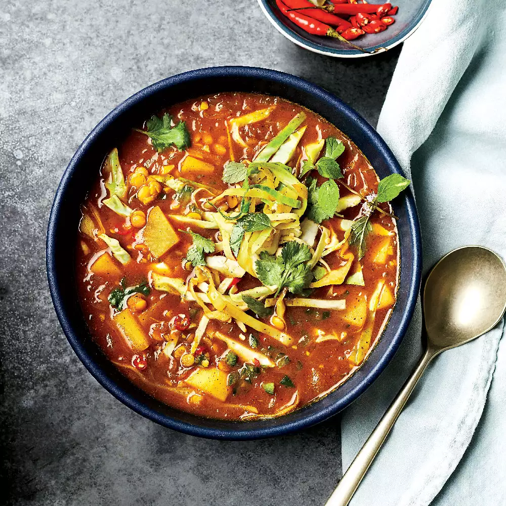 | Oil-2 tsp Lemon grass- 2-3 tbsp cut into 2-inch pieces Fresh basil leaves- 6-8 no Thai red chillies- 3-4 no Galangal/Thai ginger- 2 tbsp sliced Salt to taste Thai red curry paste-2-3 tsp Kaffir lime leaves- 3 -4 no Water-1 cup Coconut milk- 2 cups thick Brown sugar-1/2 tsp Assorted vegetables to choose from: Carrots- ¼ cup cubes Beans- ¼ cup cut Cauliflower/ broccoli- 1 cup florets Zucchini-1/4 cup cubes Babycorn- ¼ cup sliced Sweet potato -1/2 cup diced, blanched Assorted bell peppers- ½ cup cubed Sprouts-1 cup Mock meat- 1 cup chunky pieces Coriander leaves-2 tsp chopped Coconut cream- 2-3 tsp for garnish Roasted peanut powder-1-2 tsp for garnish To serve with- steamed white rice/ jasmine rice | 1. Prepare all the ingredients as per the list and keep them handy. 2. To start with the cooking of the curry, heat oil in a pan add in the Thai flavourings, like galangal, lemon grass, basil, kaffir lime leaves, etc., and saute for a few seconds, add in the Thai curry paste and a little water and mix well. 3. Now add in the assorted veggies as desired and the mock meat, and allow to simmer. Add salt to taste. 4. Pour in the coconut milk and a little water and allow to simmer for 12-14 mins, add in the brown sugar and balance up the flavour of the curry. 5. Check for seasonings, adjust the consistency of the curry as desired and add a little corn flour slurry to thicken up a bit to get the desired thickness. 6. To serve the curry, we need to have some steamed/ boiled white rice or jasmine rice. Assemble the rice and serve the curry piping hot, garnish the curry with choice of ingredients. |