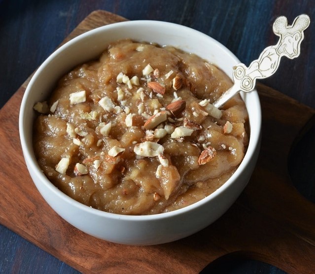 | Semolina-1/2 cup Whole-wheat flour-1/2 cup Ghee-3 tsp Oil-1 tsp White granulated sugar-3/4 cup Brown sugar-2 tsp Milk- 400 ml Hot water-250 ml Green cardamom powder-1/2 tsp Almonds-1 tbsp. chopped Raisins-2 tsp chopped Cashews-2 tbsp. chopped Banana-1 ripe, mashed Dates- 4-6 no chopped/ puree Choco chips-2-3 tsp/chocolate sauce-2 -3 tsp | 1. Heat oil along with ghee/butter in a pan, add in the semolina and whole wheat flour, and green cardamom powder and saute on a low flame for 4-5 mins. 2. Add in the sugar, both white and brown and mix. Add in hot water first, followed by warm milk a little at a time. Also, add the mashed banana and dates. 3. Cook the mixture on a low flame for 3-5 mins, mix well, add more milk if needed, check for sweetness, add in the assorted nuts and mix well. 4. Cover and simmer for another 3-4 mins, and then dish out and serve this dessert warm. We can also add more flavour to this recipe by adding fresh fruits into it by layering it in dessert cups. |