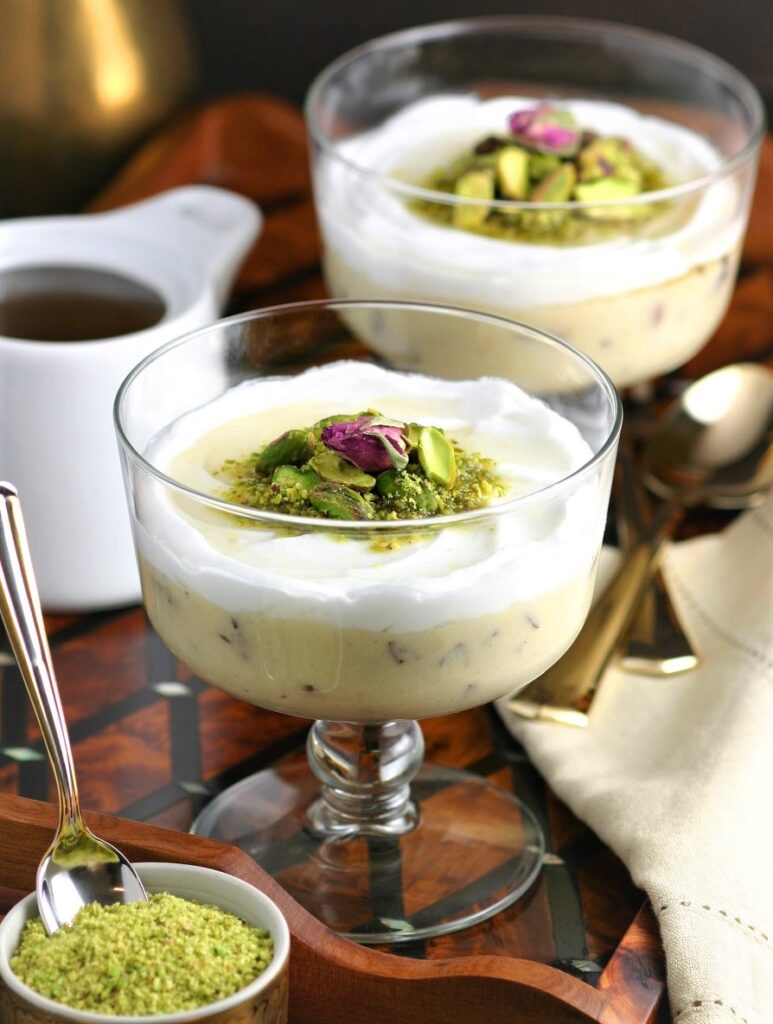 | Semolina- 1 cup, fine- lightly roasted Oil-1 tsp Ghee/butter-2 tsp Cinnamon stick -1-inch piece Soy milk- 250 ml Warm water-150 ml Almond paste-2 tsp Raisins-2 tsp chopped Sweet yogurt-1 cup Lychee pulp/ custard apple pulp-1/2 cup Pistachios-2-3 tsp chopped Rose water-2-3 tsp Condensed milk-2-3 tbsp. | 1. Prepare all the ingredients for the pudding. 2. Heat the oil, ghee/butter in a thick-bottomed pan and lightly roast the semolina in it for a couple of minutes with a piece of cinnamon. 3. Reduce the flame further and add sugar to taste and a little condensed milk, mix and add warm water first and then a little soy milk and mix, cover and simmer for 10-12 mins. 4. Add in the nuts and mix well. Cook for another 3-4 mins and turn off the flame, cool slightly. 5. Mix in the sweetened yoghurt with a little lychee pulp or custard apple pulp and chill. 6. To assemble the dessert, use tall dessert cups or glasses and place a little of the prepared semolina pudding at the base, top with the fruity yoghurt, and garnish with pistachios and other nuts. Chill the dessert for 1-2 hours and serve. |