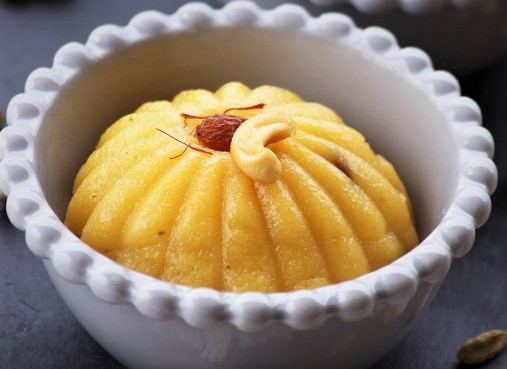 | Semolina -1 cup, lightly roasted Oil-1 tsp Ghee/butter-2 tsp Green cardamom seeds- ¼ tsp Brown sugar-2 tsp White grain sugar-1/2 cup Almonds-2 tsp, sliced Raisins-2 tsp chopped Cashews-2 tsp sliced Saffron milk solution- 2-3 tsp Milk- 750 ml Orange segments- ½ cup Chickoo-1/2 cup peeled & cubed Banana-1 ripe, sliced Honey-2-3 tbsp. Choco-chips-2-3 tsp | 1. Prepare all the ingredients for the sweet semolina recipe. 2. Using a thick-bottomed pan, saute the fine semolina with green cardamom seeds in a little oil, butter/ghee for a few minutes, add in the brown and white granulated sugar as per taste, add in boiled milk and give it a nice mix. 3. Reduce the flame and cover and simmer, allow to cook on a low flame for 8-10 mins, adjust the texture by adding more milk if needed, add in the nuts and mix well. 4. In a separate pan, stew the fruits of your choice, add in honey and fruits, a stick of cinnamon if desired for taste, also choose between using rum or brandy to flavour the fruits, apples, pears, berries etc can also be used. 5. To assemble the sweet, grease small individual moulds/ baba moulds with a little butter, spoon in a little of the warm semolina mixture halfwaya up and continue with a few stewed fruits in the center along with few chocolate chips, and again top it up with the semolina mixture all the way up. 6. Refrigerate the sweet for a couple of hours and de-mould it and serve with a topping sauce of your choice like a kiwi crush, or a berry compote etc. |