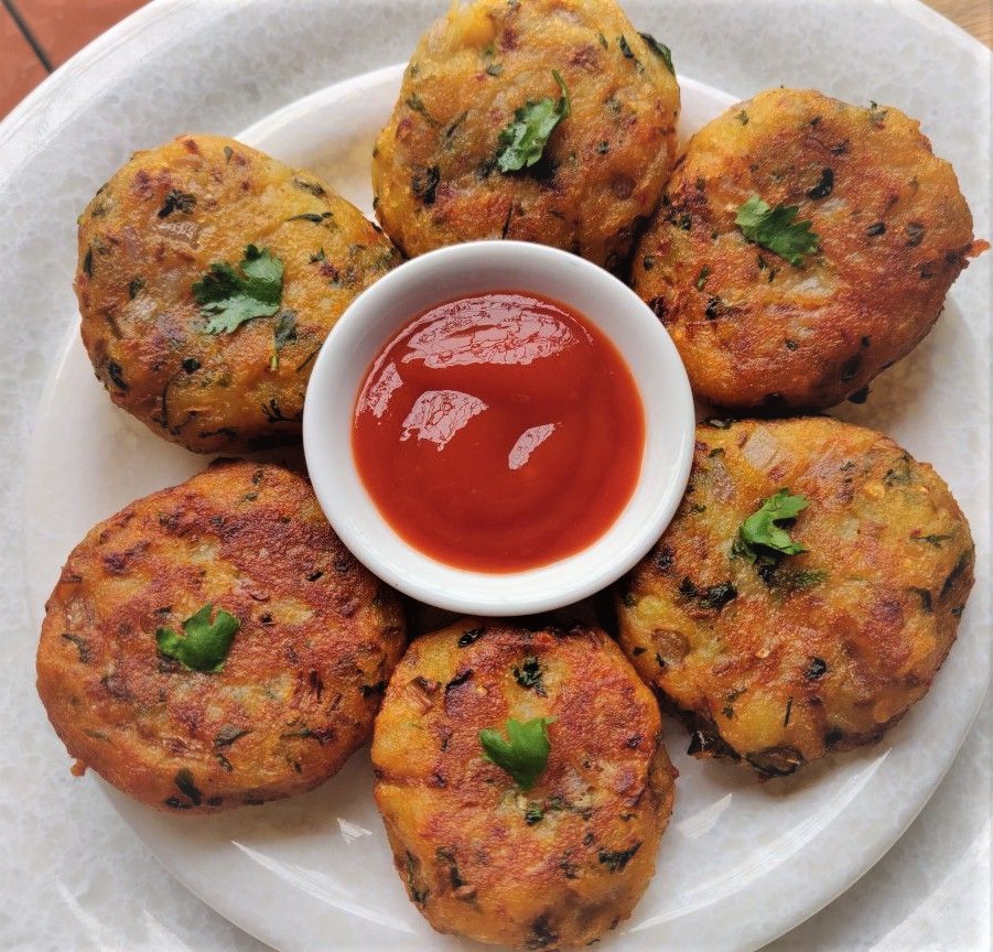 | Poha/flattened rice- 1 cup Boiled and grated sweet potato- 1 cup Oil-2 tsp Cumin seeds- 1 tsp Ginger-garlic- green chili paste- 1 tbsp. mix Onion-1 small chopped Salt and pepper to taste Red chili powder-1/2 tsp Coriander powder-1 tsp Chaat masala-1/2 tsp Roasted and crushed peanuts-2 tbsp. Coriander leaves- 2 tbsp. chopped Breadcrumbs/maida -1/4 cup for binding/coating as needed. Oil to shallow/deep fry as needed | 1. Clean the Poha and place it in a colander and wash it a couple of times under running water, drain the water well and allow the Poha to rest for 10-12 mins. 2. Heat oil in a pan add in the cumin, ginger-garlic-chili paste, onions and saute for 1 min, add in the sweet potato, Poha and all powdered masalas, salt and pepper to taste and mix well. 3. Cover and cook the mixture on a low flame for 4-5 mins turn off the flame add in the crushed peanuts, chopped coriander leaves, add a little breadcrumb to help in binding if needed and mix, remove onto a flat open plate or thali and cool for a few mins. 4. Apply oil on the fingers and hands and while the mixture is still warm divide the mixture into 8-10 portions and shape them each into ½ inch thick round flat tikkis and either shallow fry or deep fry with a light coating of maida/ breadcrumbs and serve it hot with chutney/tomato ketchup. |