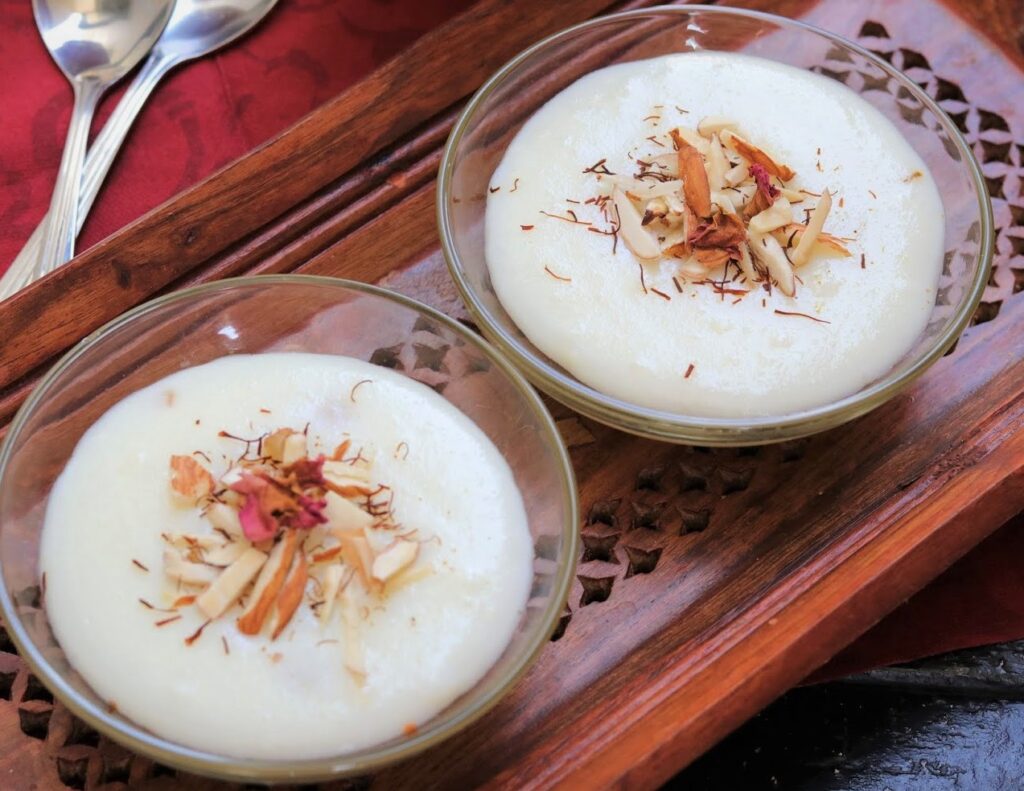 | Poha/ flattened rice- 1/2 cup powdered along with 2 tbsp. almonds. Ghee- 2 tsp Green cardamom -2-3 no Brown sugar/grain sugar/organic coconut sugar- as per taste Soy milk/ regular milk- 2 and a half cups Mava- 2 tbsp. grated- optional Dates- 2- 3 no finely chopped. | 1. Prepare the Poha and almond powder and keep aside. 2. Heat up the milk in a thick bottomed pan and add in the green cardamom, add in the ghee and sugar of your choice and to taste and mix well, add in the Poha almond powder mix and stir constantly and allow to cook on low flame for 10-12 mins. 3. Add in the chopped dates and simmer for another 6-8 mins and turn off the flame once the mixture gets a proper coating texture on the back of a tablespoon, allow to cool for few mins. 4. Dish out the badami Poha phirni into small dessert bowls add more nuts if desired, I also like to layer this dessert with fresh fruit like mango/kiwi/ berries or even by adding in some custard apple pulp to it, chill for a couple of hours and garnish with a few sliced nuts and serve. |