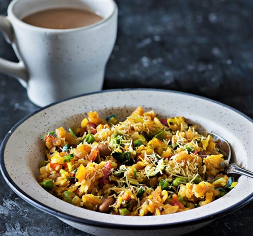 | Poha/ flattened rice- 1 and a half cup Oil- 2 tsp Curry leaves- 8-10 no Green chilies-2 chopped Cumin seeds- ½ tsp Mustard seeds-1/2 tsp Slit red chilies- 2 no Onion-1 med size chopped Tomato- 1 med sized chopped Ginger-2 tsp chopped Salt and pepper powder to taste Turmeric powder- ½ tsp Red chili powder-1/2tsp Coriander powder-1 tsp Garam masala powder-1/4 tsp Water-1/2 cup Sweet corn-1 cup boiled Coconut-1/4 cup fresh or 2 tbsp. desiccated. Green capsicum-1/2 no cut into small cubes Sprouts-1 cup Coriander leaves-2 tbsp. chopped Lime juice- 2 tsp add and serve hot. | 1. Clean the Poha and place it in a colander and wash it a couple of times under running water, drain the water well and allow the Poha to rest for 10-12 mins. 2. Heat oil in a pan add in the ingredients for the tadka starting with curry leaves, red chilies, green chilies, cumin, mustard, ginger and saute them for a few seconds, add in the onion and cook until light pink, add in the tomatoes and powdered spices and little water and allow the masala to cook for 2-3 mins. 3. Now add in the boiled corn, capsicums along with any other choice of vegetables/non-veg as desired into the masala along with coconut and allow to cover and cook on low flame for 2-3 mins. 4. Add in the drained Poha, coriander leaves and give it all a nice mix, cover and simmer for another 4-5 mins and serve hot adding a splash of fresh lime juice. |