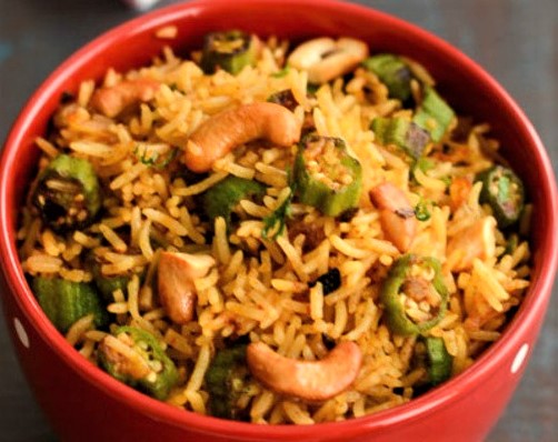| Boiled white rice- 2 cups cooked Ladyfingers/bhindi- 150 gms cut into pieces Oil- 2 tbsp. Garlic- 1 tsp chopped Ginger – 1 tsp chopped Green chillies- 2 no slit Onion-1 small chop. Schezuan sauce- 1 tbsp. Salt and pepper to taste Tomato ketchup- 1 tbsp. Soy sauce- 1 tsp Red and green chilli sauce- 1 tsp each Assorted mix veggies- carrots/beans/peas/ potatoes- any of your choice to be cut into small pieces and blanched/boiled. Coriander leaves- 2 tsp chopped Roasted/fried peanuts/cashews- 2 tbsp. | 1. Prepare the rice and keep it aside. 2. Heat oil in a pan/wok, saute the ginger, garlic, chillies, and onion for 15 seconds. 3. Add in the veggies of your choice, cut ladyfinger pieces and add salt and pepper. Sauté well for a minute. 4. Cover and simmer for 4-6 mins, allowing veggies to cook in steam, add in the sauces, a little water, and allow to cook for another 2-3 mins in steam. If desired, we can fry the ladyfingers as well and then add them to the rice for crispy texture. 5. Finally, add in the cooked rice, toss well and check for salt. 6. Garnish with fried nuts, coriander and serve hot. For Non-Veg: Add boiled cubed eggs/ boiled cubes of chicken/ sliced chicken sausages/ also try adding baked beans/ cubes of paneer/tofu. |